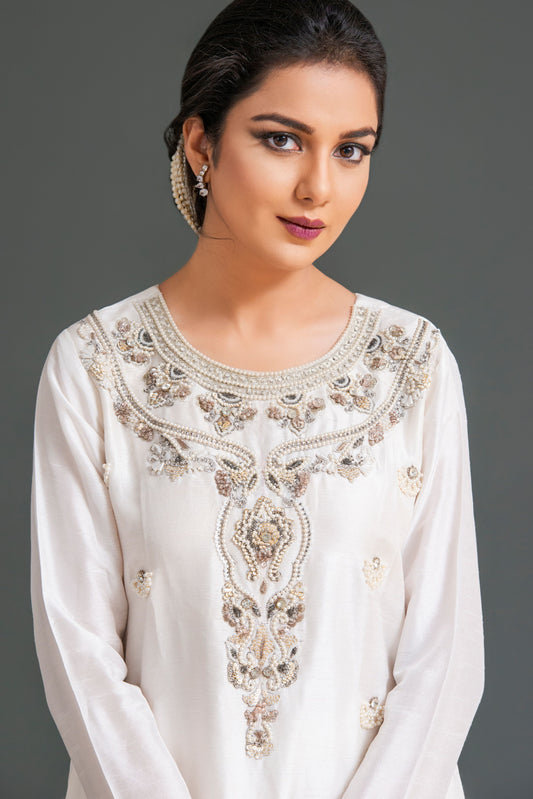 Material: Silk Detail: Ada work neck, Pearl, Dabka Stones, Sitara. and pearls/moti spray on shirt...