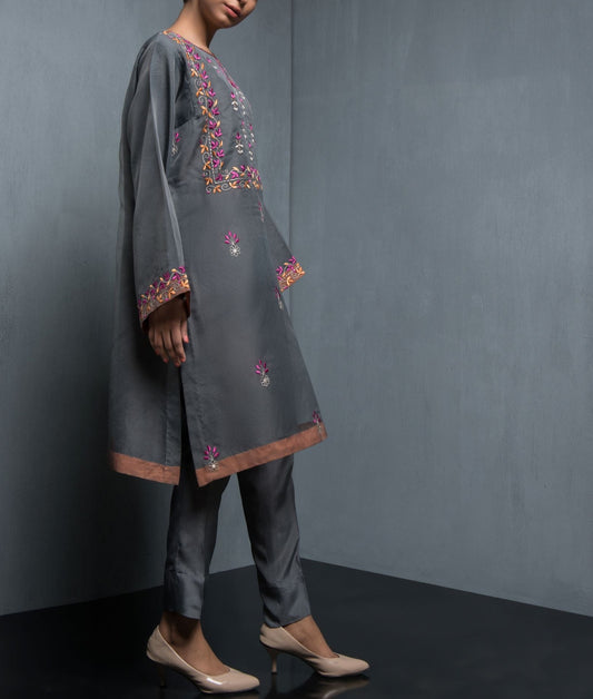 Top Material: Silk Detail: Plain shirt, ada work with pearls, dabka, tilla work Cut: Straight...