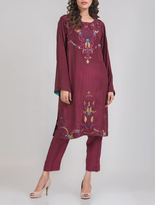 Shirt Material: Net SilkTrouser Material: ViscoseColor: CranberryDesign Details: Shirt features delicate Dark Grey embroidery at...