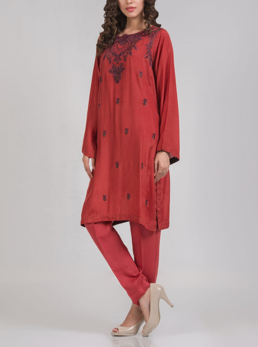 Shirt Material: Net SilkTrouser Material: ViscoseColor: VermilionDesign Details: A combination of Multi-Colour Embroidery on the...