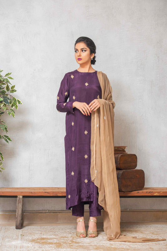 Top Material: Silk Detail: Dull gold thread embriodery on neck & sleeves coupled with motif...