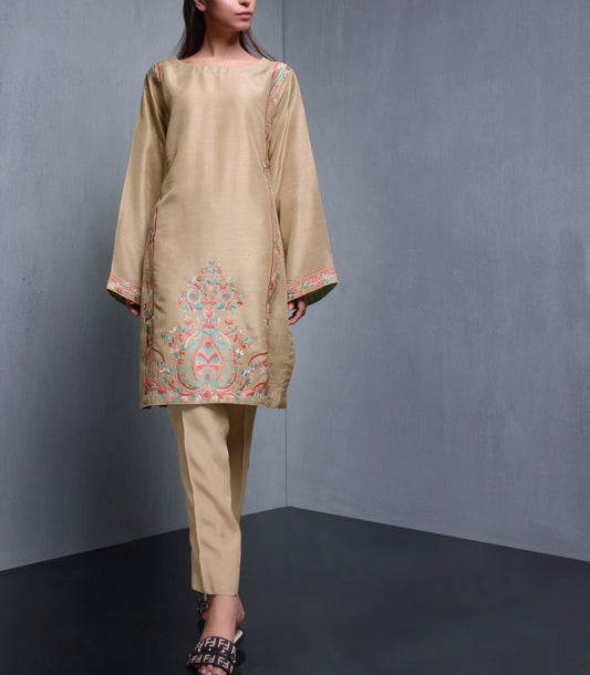 Shirt Material - Raw/Nest Silk Lower Material - Fine Viscose Color - Beige Design - Plain Beige base with mutlicolored embroidery...