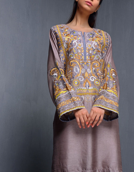 Shirt Material - Raw/Nest Silk Lower Material - Fine Viscose Color - Mauve Design - Grey base with yellow and...