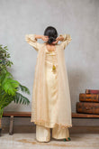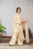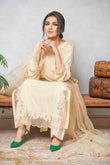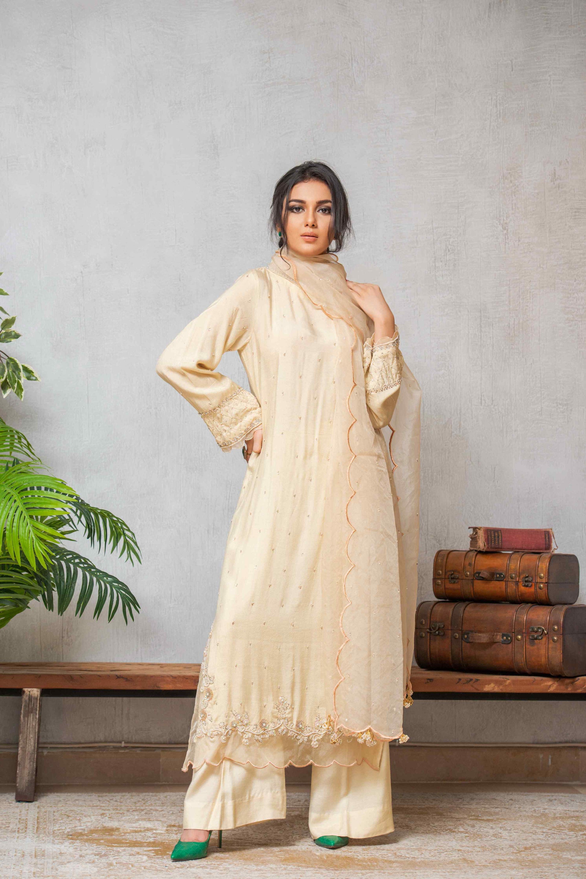 Detail: Ada work pearls, sequence, dabka on sleeves and daaman. Pearls spray all over shirt